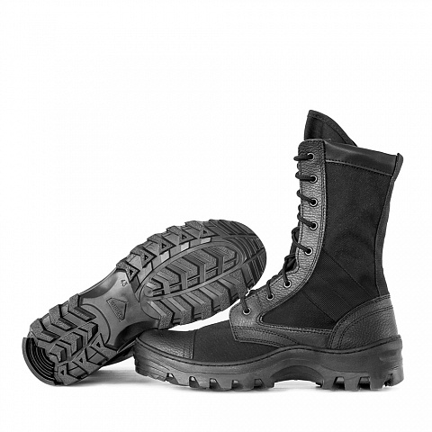 Ботинки с высокими берцами. Жарким летом всегда хочется одеть на ноги такую обувь, что бы ноги «дышали», было легко и удобно. Это модель – следствие пожеланий бойцов из разведывательных подразделений Республики Беларусь, для которых первостепенным фактором при долгих пеших переходах в условиях жары являлась именно легкость и хорошая циркуляция воздуха внутри ботинка. Именно этим требованиям и отвечает эта модель. Использование в ней натуральной кожи «Велюр» сошло к минимуму, усиленными остались лишь те части ботинка, которые наиболее подвержены износу или являлись травмаопасными для владельца. В целом, ботинок практически весь состоит из дышащего материала CORDURA®: легок, надежен и прост. Верх: комбинированный: натуральная кожа спилок “Велюр”, ткань “Cordura” Du Pont®. Подошва: ТЭП (термоэластопласт) “RUNNER” (±40C). Метод крепления подошвы: клеепрошивной. Супинатор: металлический. Подносок: усиленный из термопластического материала. Задник: жесткий из термопластического материала. Высота берца: 245 ± 3 мм. Фурнитура: блочки. Материал подкладки: CAMBRELLE®/ SUPER ROYAL® – материалы для обувной подкладки и стелек, стойкие к истиранию и обладающие высокими антибактериальными и противо-грибковыми свойствами, похожи на губку, очень пористые, впитывают в три раза больше влаги, чем весят сами. Эти материалы быстро высыхают и позволяют влаге циркулировать, так что Вашим ногам сухо и комфортно весь день.